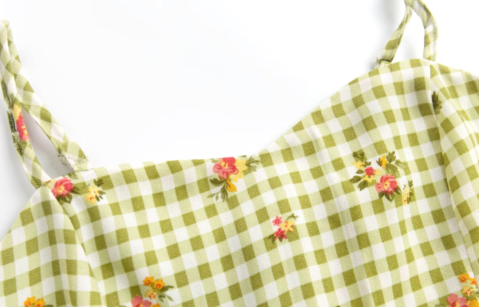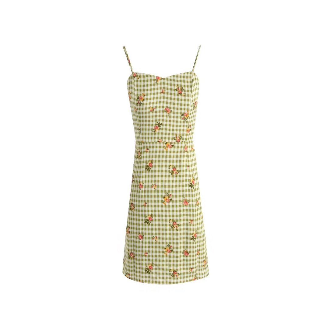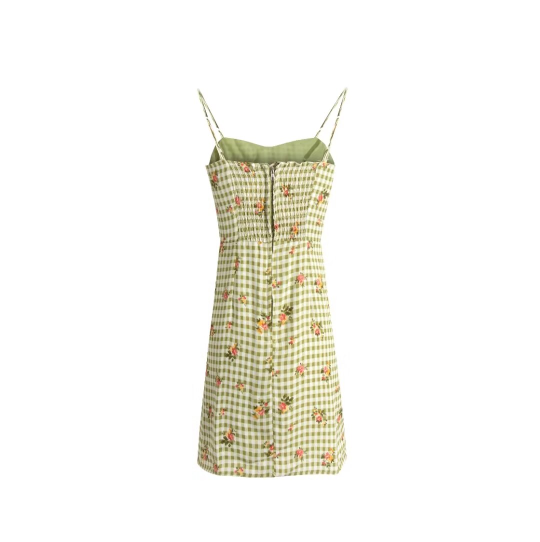 Summer Plaid Floral Print High Waist Slim Strap Dress Short Dress